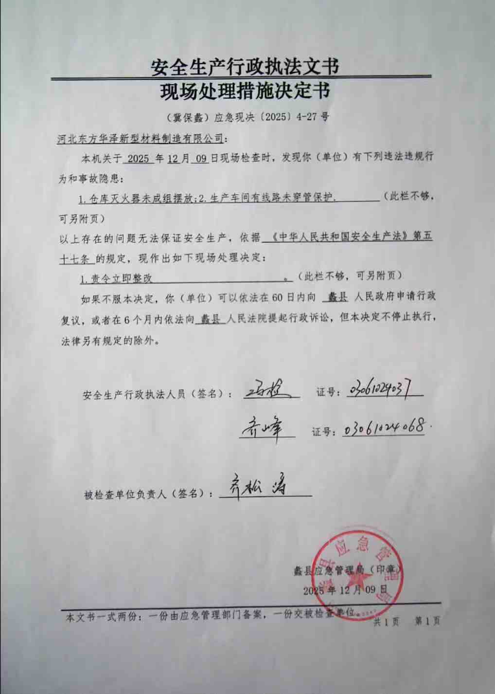 对河北东方华泽新型材料制造有限公司的安全生产检查